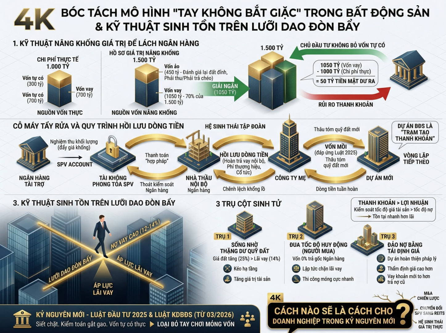Mô hình "tay không bắt giặc" bản chất là một nghệ thuật chiếm dụng vốn đa tầng. Trong bối cảnh chi phí vốn cao (12-14%), doanh nghiệp không chỉ dùng đòn bẩy để xây dựng, mà dùng đòn bẩy để tạo ra dòng tiền tuần hoàn.