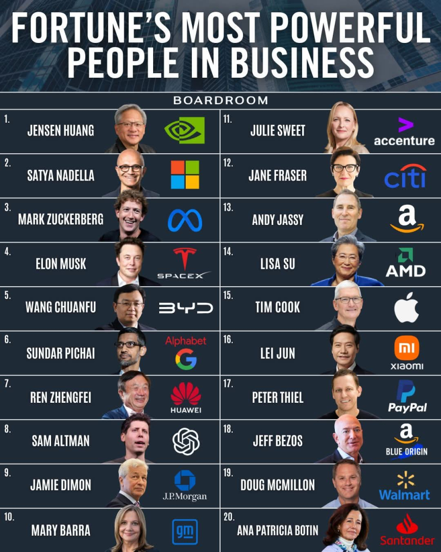 Huang đứng đầu top 10, nơi bị thống trị bởi các CEO công nghệ lớn – tất cả đều đang tranh giành chip AI từ NVIDIA.