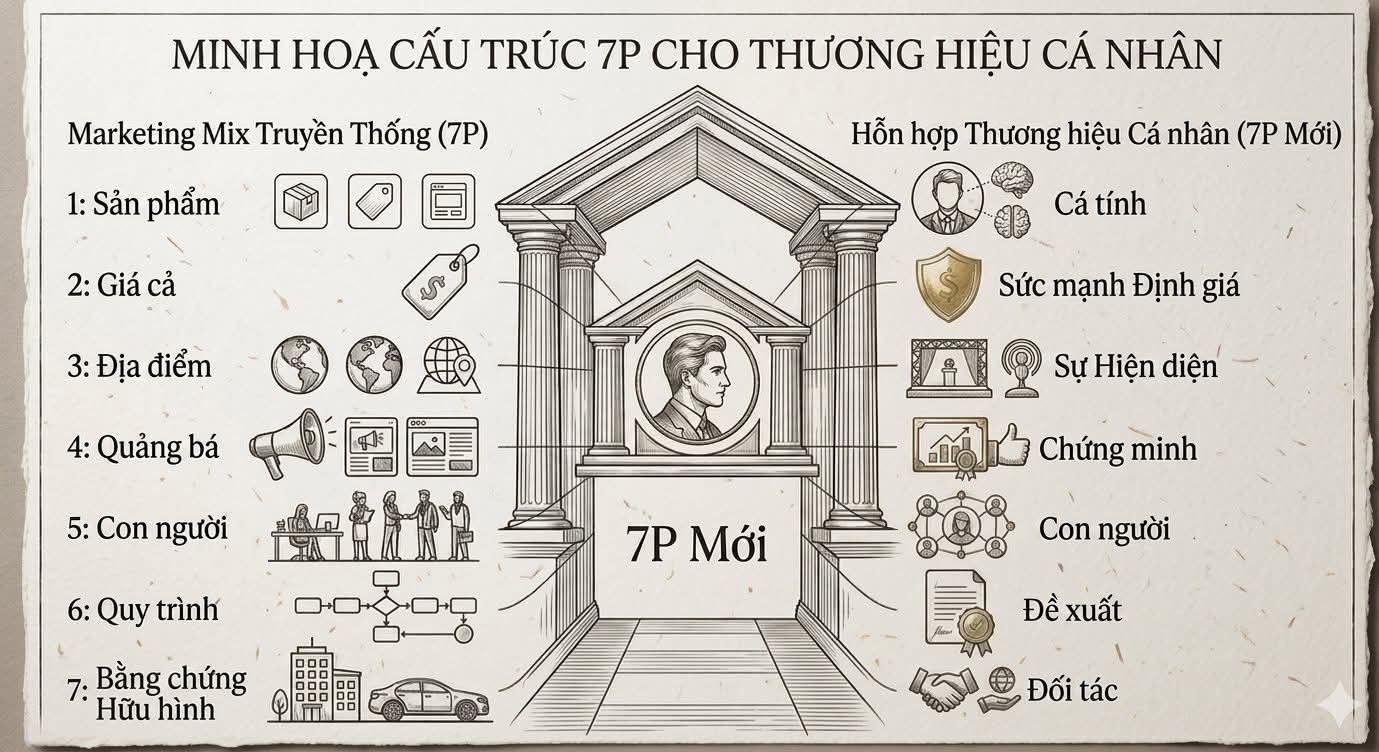 Hệ thống 7P Personal Brand dưới đây chính là "bản đồ gene" giúp bạn cấu trúc lại toàn bộ sự diện hiện của mình, đi từ lõi nhân dạng bên trong cho đến cách thức thiết lập vị thế và xây dựng hệ sinh thái quyền lực bên ngoài.