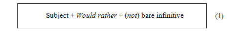 Động từ sau Would rather là nguyên thể bỏ to. Nếu muốn dùng phủ định đặt not trước động từ nguyên thể bỏ to ( công thức 1)