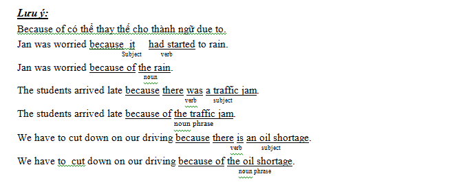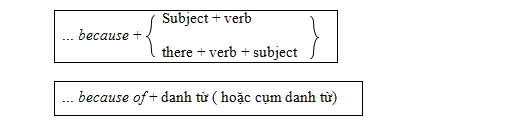 Because ( không có of) đòi hỏi đằng sau nó là một câu hoàn chỉnh (phải có chủ ngữ và động từ). Because of đòi hỏi đằng sau nó là một danh từ hoặc 1 ngữ danh từ ( không được phép có động từ liên hợp).