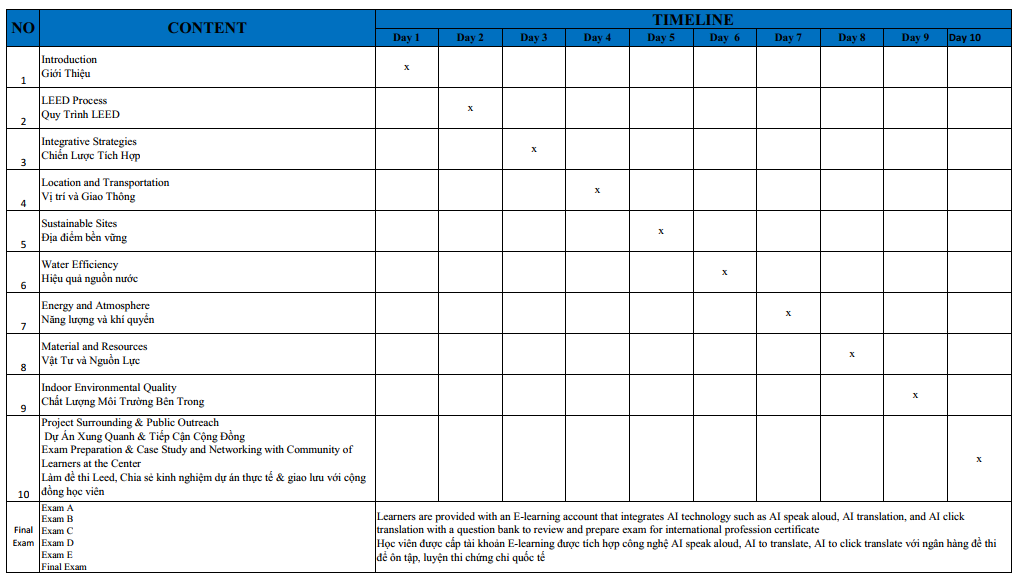 Chương trình tiêu chuẩn và luyện thi chứng chỉ LEED GA của trung tâm có tính thực tiễn cao và tập trung vào xây dựng và quản lý các dự án xanh và bền vững. Điểm mạnh lớn nhất là khả năng áp dụng ngay kiến thức và kỹ năng học được vào công trình dự án thực tế